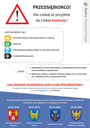 Urząd Marszałkowski Województwa Śląskiego zaprasza na bezpłatne szkolenia dotyczące sporządzania i przekazywania rocznego sprawozdania o wytwarzanych odpadach i o gospodarowaniu odpadami: Ulotka informacyjna Program szkoleń Karta zgłoszenia na szkolenie Szczegółowe informacje, stawki oraz aktywne formularze dot. opłaty za korzystanie ze środowiska znajdują się na stronie: http://bip.slaskie.pl/index.php?grupa=40&id=22&grupaj=12 |