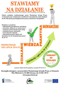 Powiatowy Urząd Pracy w Cieszynie w dniach od 01.06.2016r. do 31.12.2017 r. realizuje projekt konkursowy pn. ,"Stawiamy na działanie", który jest współfinansowany ze środków Europejskiego Funduszu Społecznego w ramach Poddziałania 1.2.1 Programu Operacyjnego Wiedza Edukacja Rozwój (Priorytet I – Osoby młode na rynku pracy, Działanie 1.1 - Wsparcie osób młodych pozostających bez pracy na regionalnym rynku pracy, Poddziałanie 1.2.1 Wsparcie udzielane z Europejskiego Funduszu Społecznego).