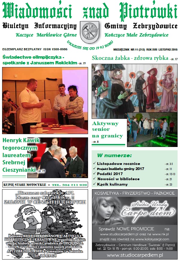 Na stronie www.wzp.zebrzydowice.pl opublikowano najnowsze wydanie Gminnego Biuletynu Informacyjnego (listopad 2016) -  Wiadomości znad Piotrówki.