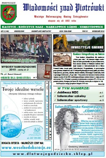 Ukazał się najnowszy numer Wiadomości znad Piotrówki NR 9 (140) – biuletynu informacyjnego Gminy Zebrzydowice. W najnowszym wydaniu gazety przeczytacie państwo m.in. na temat zakończenia realizacji projektu E-oferta – aktywna promocja multimedialna, o realizowanych inwestycjach gminnych, o tym, że wkrótce dobiegnie końca konkurs fotograficzny. Znajdziecie państwo także niezbędne informacje dotyczące wyborów samorządowych. Czytelnicy przeczytają również o szczegółach Jubileuszu Pszczelarzy i uhonorowaniu marklowickiego bohatera płk pil. Bernarda Adameckiego. Nie zabrakło również stałych rubryk – informatora szkolnego i kącika kulinarnego. To nie jedyne informacje w gazecie - Zapraszamy do lektury! Najnowszy numer w wersji elektronicznej (w kolorze!) pobrać można stąd [ KLIKNIJ ] Do otwarcia wymagany jest program do odczytu plików PDF np. Foxit Reader lub Acrobat Reader.