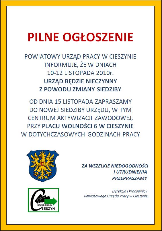 PUP w Cieszynie - zmiana siedziby - NIECZYNNY W DNIACH 10-12.11.2010