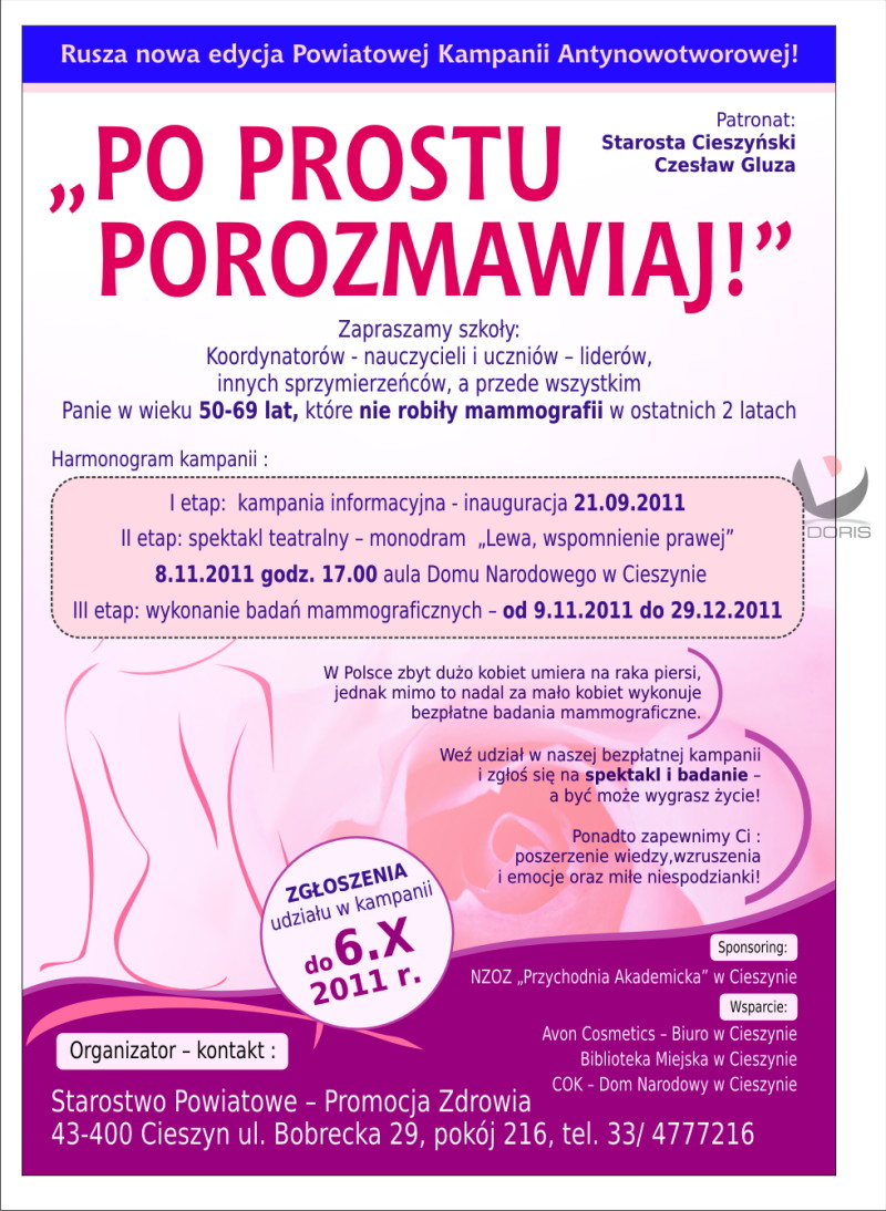Trwa Powiatowa Kampania Antynowotworowa 2011 „Po prostu porozmawiaj!”. Jeśli jesteś kobietą w wieku 50-69 lat i nie robiłaś mammografii w ciągu 2 ostatnich lat, zgłoś się do nas szybko i skorzystaj z darmowego spektaklu profilaktycznego „Lewa, wspomnienie prawej” w wykonaniu Teresy Stępień-Nowickiej na podstawie książki Krystyny Kofty. Odbędzie się on 8 listopada o godz. 17.00 w Domu Narodowym w Cieszynie. Podczas spektaklu uczestniczki dostaną darmowe zaproszenia na mammografię, którą będą mogły sobie wykonać jeszcze w tym roku w dogodnym dla siebie terminie. Będą niespodzianki i nagrody, kawa i ciasto, więc nie zwlekaj i już teraz zgłoś się po bilet do udziału w spektaklu. ULOTKA PLAKAT