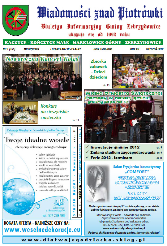Pierwszy w tym roku numer Wiadomości znad Piotrówki, Gminnego Biuletynu Informacyjnego Gminy Zebrzydowice można już pobrać ze strony internetowej gazety www.wzp.zebrzydowice.pl (nr 1/156/2012 link bezpośredni - KLIKNIJ ). Przypominamy, że do czytania gazety w wersji elektronicznej (PDF) wymagany jest program do odczytu plików w formacie PDF np. Adobe Reader lub Foxit Reader. W tym numerze przeczytacie państwo m.in. o nowym rekordzie Wielkiej Orkiestry Świątecznej Pomocy – zebrano ponad 18 tysięcy złotych, o Noworocznym Koncercie Kolęd w wykonaniu Chóru Mieszanego „Echo”, który w tym roku obchodzi swoje 75-lecie powstania. Nie zabrakło tradycyjnie wiadomości sportowych oraz szkolnych. Gazetę zamyka tradycyjnie kącik kulinarny Teresy Kondziołki.