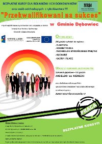 Urząd Gminy Dębowiec informuje o bezpłatnych kursach dla rolników i ich domowników zamieszkałych na terenie województwa śląskiego. W przypadku zebrania grupy 10 osobowej kursy będą się odbywać na terenie Gminy Dębowiec.