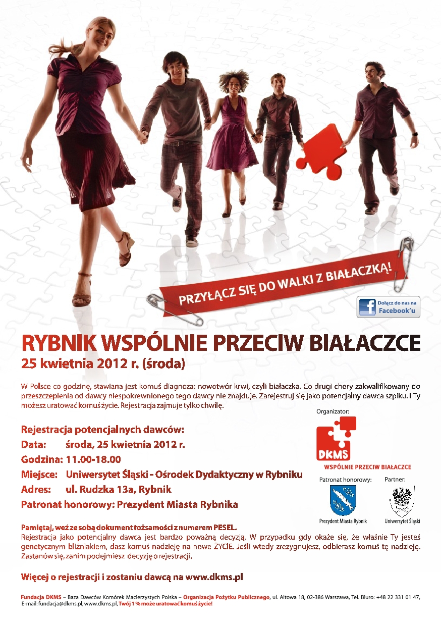 Fundacja DKMS Polska już trzeci raz gości na Uniwersytecie Śląskim w Rybniku organizując wspólnie ze studentami akcję rejestracji potencjalnych dawców szpiku. Wspólnie zarejestrowaliśmy już 743 nowych potencjalnych dawców szpiku. W marcu 2011 roku w Ośrodku Dydaktycznym Rybnickiego Uniwersytetu Śląskiego, zarejestrował się ówczesny student UŚ, Pan Karol Leśnikowski. Kierował się chęcią pomocy osobom chorym oczekującym na przeszczepienie od swojego bliźniaka genetycznego, aby dać im szansę na życie. Okazało się, że ktoś potrzebuje jego pomocy. Od razu podjął decyzję i oddał szpik, aby pomóc komuś, kto bardzo tego potrzebuje. W Polsce nie udaje się znaleźć dawcy, dla co drugiego pacjenta zakwalifikowanego przeszczepienia od dawcy niespokrewnionego. Wspólnie z Uniwersytetem Śląskim Fundacja DKMS Polska organizuje Dzień Dawcy Szpiku w Rybniku. Rejestracja potencjalnych dawców odbędzie się: Data: środa, 25 kwietnia 2012 r. Godzina: 11.00 - 18.00 Miejsce: Uniwersytet Śląski - Ośrodek Dydaktyczny Adres: ul. Rudzka 13a, Rybnik