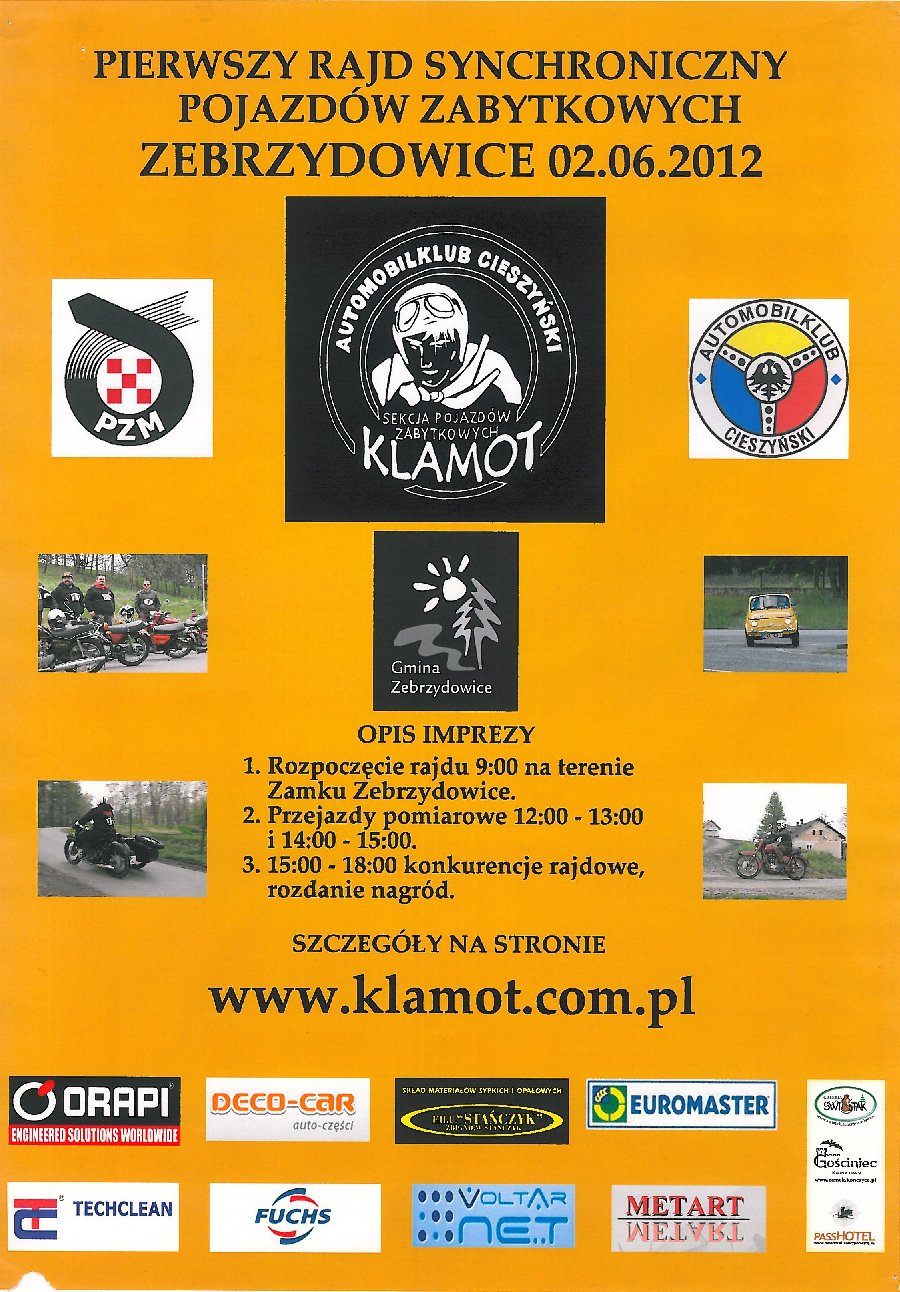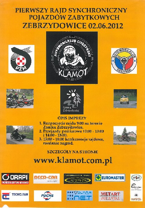 W sobotę 02.06.2012 odbędzie się w Zebrzydowicach Rajd Synchroniczny. Rajd synchroniczny to dwukrotny przejazd zamkniętego odcinka drogi w celu uzyskania dwóch zbliżonych wyników czasowych. Zwycięzcą jest zawodnik który osiągnie najmniejsza różnicę czasowa. - Na naszym rajdzie nie liczy się szybkość ani moc tylko równe tępo jazdy - zwyciężyć może każdy! Trasa rajdu liczy 3km drogi gminnej asfaltowej w malowniczo położonym rejonie okolic zamku w Zebrzydowicach – zachęcają do udziału w zawodach organizatorzy. Atrakcyjność przejazdu podnoszą liczne wzniesienia i zakręty. Organizator zapewnia ducha sportowej weterańskiej rywalizacji na zapomnianych już dziś maszynach. Warto zaznaczyć, że pojazdy biorące udział w rajdzie sa wyprodukowane pomiędzy 1936 a 1982 rokiem produkcji! Uwaga mieszkańcy, w czasie rajdu (tj w godzinach przejazdów czyli 12:00-13:00 oraz 14:00-15:00) drogi znajdujące się na trasie wyłączone zostaną z ruchu (Mapa rajdu KLIKNIJ )