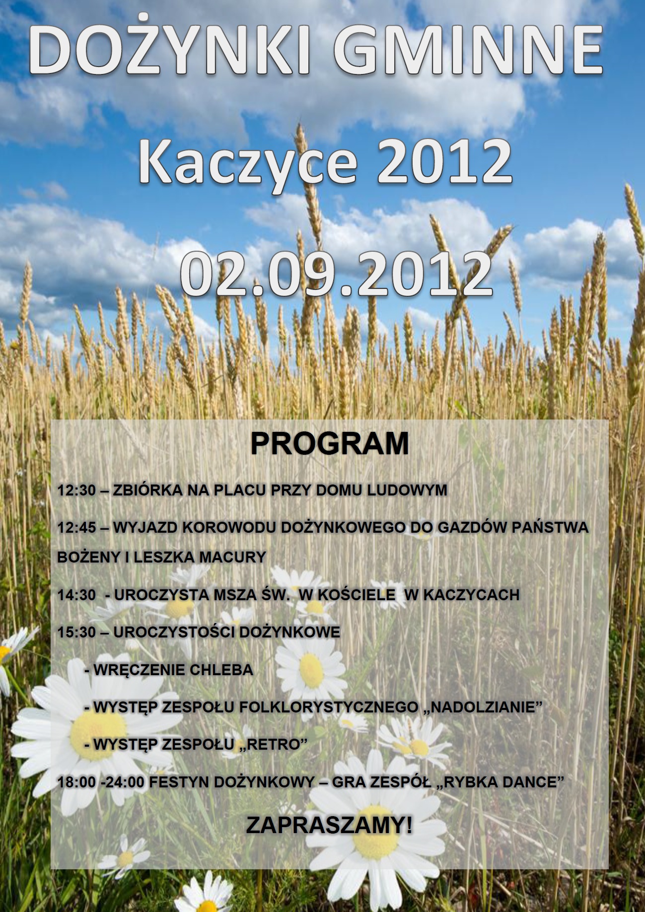Zapraszamy do udziału w Gminnych Dożynkach, które w tym roku odbędą się w Kaczycach 2 września. Szczegóły na plakacie poniżej. Kliknij w plakat aby powiększyć: