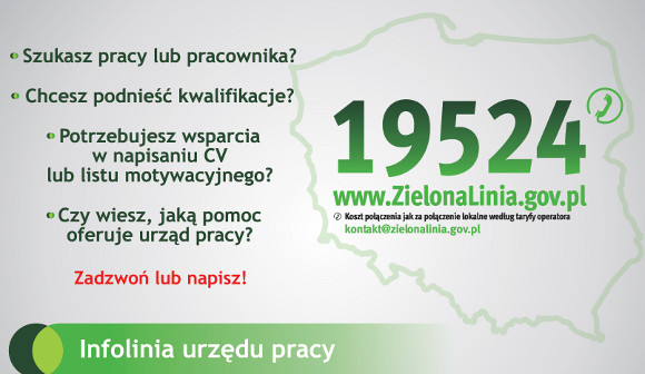 Centrum "Zielona Linia", to pierwsze w kraju Centrum Kontaktowe dla Klientów urzędów pracy z całej Polski. Założycielem Centrum jest Centrum Rozwoju Zasobów Ludzkich w Warszawie, jednostka Ministerstwa Pracy i Polityki Społecznej. Centrum "Zielona Linia" umożliwia kontakt Klienta z urzędem za pośrednictwem różnych kanałów dostępowych (telefon, e-mail, formularze internetowe, konta osobiste na portalu) zamiast osobistej wizyty w urzędzie. Misją Centrum "Zielona Linia" jest stworzenie nowej jakości w relacjach z bezrobotnymi i pracodawcami. Współpracując z pracodawcami Centrum "Zielona Linia" pośredniczy w rekrutacji pracowników, natomiast osoby poszukujące pracy i bezrobotni mogą liczyć na szeroką pomoc w zakresie pośrednictwa ofert pracy, szkoleń oraz upowszechniania informacji o usługach rynku pracy. Centrum "Zielona Linia" tworzy nową usługę urzędów pracy, która kreuje zupełnie nową rzeczywistość dla Klientów Służb Zatrudnienia. Specjaliści Centrum telefonicznie oraz e-mailowo (do listopada planujemy uruchomić również czat) odpowiadają na pytania z zakresu ustawy o promocji zatrudnienia i instytucjach rynku pracy oraz m.in. kodeksu pracy, zakładania działalności gospodarczej. Pomagają wyjaśnić zawiłe sytuacje, informują o dostępnych formach pomocy z urzędu pracy (między innymi tj. stypendium na kontynuowanie nauki, dofinansowanie do studiów podyplomowych, staż), czy możliwości odbycia szkoleń finansowanych zarówno ze środków Funduszu Pracy jak i środków unijnych. Centrum "Zielona Linia" oferuje również pomoc w wyszukiwaniu ofert pracy, a od września br. uruchamia bezpłatną pomoc w przygotowaniu profesjonalnego cv oraz listu motywacyjnego. Usługi Centrum realizowane są przy wykorzystaniu nowoczesnych narzędzi komunikacyjnych, przez co w sposób szczególny mogą zainteresować ludzi korzystających dotąd z bezpośredniej formy kontaktu z urzędem.. Działania Centrum "Zielona Linia" aktywnie wspiera Ministerstwo Pracy i Polityki Społecznej zachęcając do korzystania z usług Contact Center wszystkie osoby szukające informacji na temat instrumentów i świadczeń urzędów pracy, a także informacji o ofertach pracy, szkoleniach, itp.