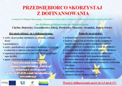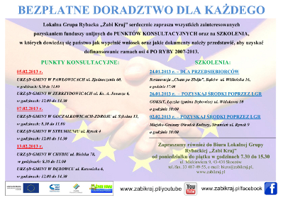 Bezpłatne doradztwo dla każdego Lokalna Grupa Rybacka "Żabi Kraj" serdecznie zaprasza wszystkich zainteresowanych pozyskaniem funduszy unijnych do PUNKTÓW KONSULTACYJNYCH oraz na SZKOLENIA, w których dowiedzą się państwo jak wypełnić wniosek oraz jakie dokumenty należy przedstawić, aby uzyskać dofinansowanie ramach osi 4 PO RYBY 2007-2013. BEZPŁATNE PUNKTY KONSULTACYJNE: 05.02.2013 r. - URZĄD GMINY W PAWŁOWICACH ul. Zjednoczenia 60, w godzinach: 8.30 do 11.00 - URZĄD GMINY W ZEBRZYDOWICACH ul. Ks. A. Janusza 6,w godzinach: 12.00 do 14.30 07.02.2013 r. - URZĄD GMINY W GOCZAŁKOWICACH-ZDROJU ul. Szkolna 13, w godzinach: 8.30 do 11.00 - URZĄD GMINY W STRUMIENIU ul. Rynek 4, w godzinach: 12.00 do 14.30 13.02.2013 r. - URZĄD GMINY W CHYBIU ul. Bielska 78, w godzinach: 8.30 do 11.00 - URZĄD GMINY W DĘBOWCU ul. Katowicka 6, w godzinach: 12.00 do 14.30 BEZPŁATNE SZKOLENIA: 24.01.2013 r. - DLA PRZEDSIĘBIORCÓW, Restauracja "Chata po Zbóju", Bąków ul. Wiślańska 16, o godzinie 17:00 26.01.2013 r. - "POZYSKAJ ŚRODKI POPRZEZ LGR" GOKSiT, Łączka (gmina Dębowiec) ul. Widokowa 10,o godzinie 10:00 02.02.2013 r. - "POZYSKAJ ŚRODKI POPRZEZ LGR" Miejsko-Gminny Ośrodek Kultury, Strumień ul. Rynek 9, o godzinie 10:00 Liczba miejsc na szkolenia ograniczona. Zgłoszenia na szkolenia oraz zapisy na indywidualne konsultacje przyjmuje biuro LGR "Żabi Kraj".