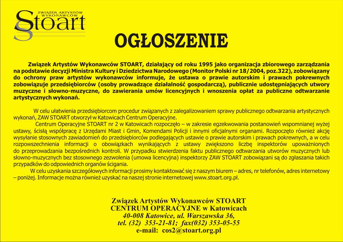 Prowadzisz firmę i odtwarzasz muzykę? Przeczytaj koniecznie Poniżej publikujemy ogłoszenie, jakie do samorządów zostało wystosowane przez STOART: Związek Artystów Wykonawców STOART, działający od roku 1995 jako organizacja zbiorowego zarządzania na podstawie decyzji Ministra Kultury i Dziedzictwa Narodowego (Monitor Polski nr 18/2004, poz.322), zobowiązany do ochrony praw artystów wykonawców informuje, że ustawa o prawie autorskim i prawach pokrewnych zobowiązuje przedsiębiorców (osoby prowadzące działalność gospodarczą), publicznie udostępniających utwory muzyczne i słowno-muzyczne, do zawierania umów licencyjnych i wnoszenia opłat za publiczne odtwarzanie artystycznych wykonań. W celu ułatwienia przedsiębiorcom procedur związanych z zalegalizowaniem sprawy publicznego odtwarzania artystycznych wykonań, ZAW STOART otworzył w Katowicach Centrum Operacyjne. Centrum Operacyjne STOART nr 2 w Katowicach rozpoczęło - w zakresie egzekwowania postanowień wspomnianej wyżej ustawy, ścisłą współpracę z Urzędami Miast i Gmin, Komendami Policji i innymi oficjalnymi organami. Rozpoczęto również akcję wysyłanie stosownych zawiadomień do przedsiębiorców podlegających ustawie o prawie autorskim i prawach pokrewnych, a w celu rozpowszechnienia informacji o obowiązkach wynikających z ustawy zwiększono liczbę inspektorów upoważnionych do przeprowadzania bezpośrednich kontroli. W przypadku stwierdzenia faktu publicznego odtwarzania utworów muzycznych lub slowno-muzycznych bez stosownego zezwolenia (umowa licencyjna) inspektorzy ZAW STOART zobowiązani są do zgłaszania takich przypadków do odpowiednich organów ścigania. W celu uzyskania szczegółowych informacji prosimy kontaktować się z naszym biurem - adres, nr telefonów, adres internetowy -poniżej. Informacje można również uzyskać na naszej stronie internetowej www.stoart.org.pl. Związek Artystów Wykonawców STOART CENTRUM OPERACYJNE w Katowicach 40-008 Katowice, ul. Warszawska 36, UL (32) 353-21-81; fax(032) 353-05-55 e-mail: cos2@stoart.org.pl |